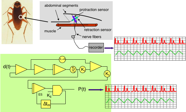The nervous systems of humans and cockroaches share a common architectural element – neurons. Understanding neurons is important to understanding human brains and intelligence. Cockroach neurons are easier to study, because they a big, and an individual neurons can be more easily instrumented and recorded. To better understand what goes on inside a neuron, we built a circuit on an analog computer that was able to produce a series of pulses in response to a stimulus pattern, that was the same series of pulse as produced by a cockroach neuron when its stretch receptor is stretched and released with the same stimulus pattern.