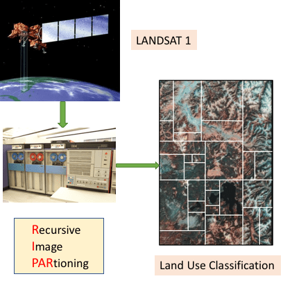 The LANDSAT 1 satellite sent digital images from space, showing the reflectance of the earth in four spectral or ‘color’ bands. These images arrived as streams of numbers, four reflectance values for each 30 meter patch of earth. Statistical techniques had been developed to classify materials on the earth’s surface based on distinctive patterns in the four numbers, however these methods were not able to take advantage of shape and texture, hugely important to human photo interpretation. Dr. Robertson developed a technique to ‘partition’ the digital image stream into areas of uniform reflectance or texture, so that shape and texture could be used in the automatic classification process.